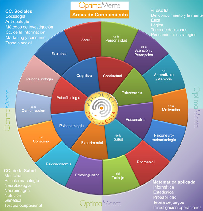 - Interdisciplinares, integran múltiples áreas del conocimiento en relación con la mente. A la amplia base de conocimientos de las áreas de la psicología sumamos los más relevantes procedentes de otras áreas del saber humano, como mostramos es esta imagen: